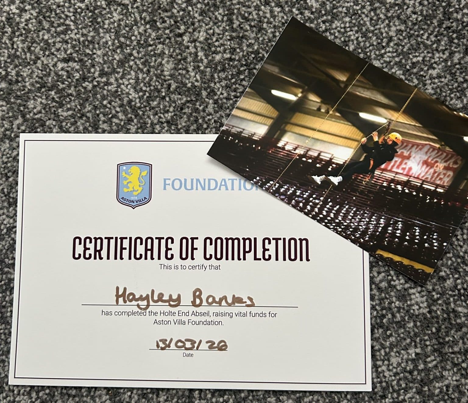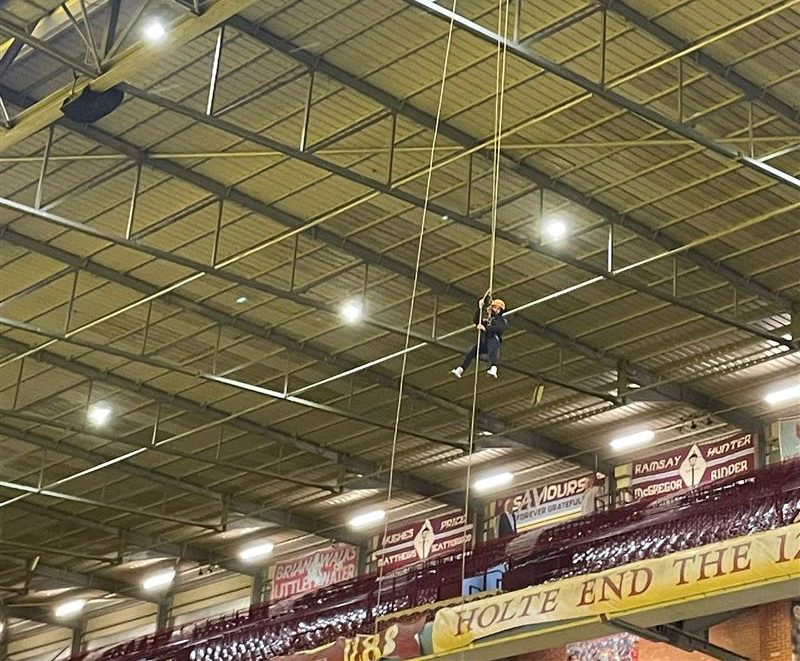 She abseiled from Holte End, the most famous stand at Villa Park, historically renowned as one of Europe’s largest behind-the-goal terraces. The extra twist was that it took place in the evening, so they were abseiling in the dark.